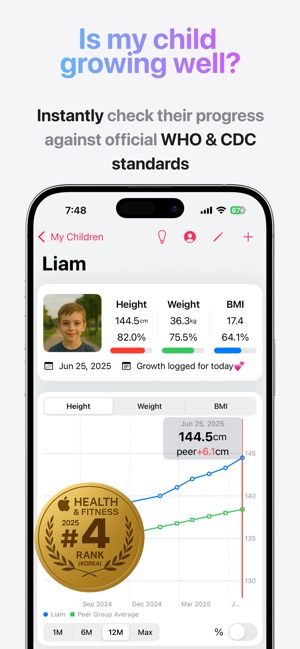 The app provides a user-friendly interface for tracking your child's growth journey while ensuring complete privacy and utilizing the most current pediatric growth standards.